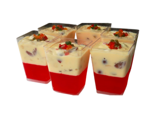 Minimum 20 orders - $5.99 each. A fruit cocktail trifle shot is a layered, individual-sized dessert served in a small glass. It features the classic components of a traditional trifle, including custard or cream, and fruit, but is made in a compact, single-serving portion