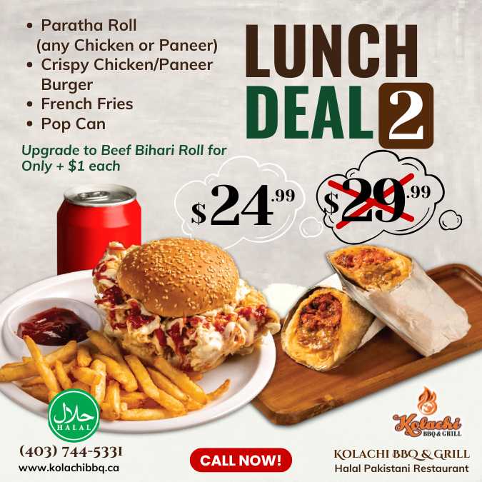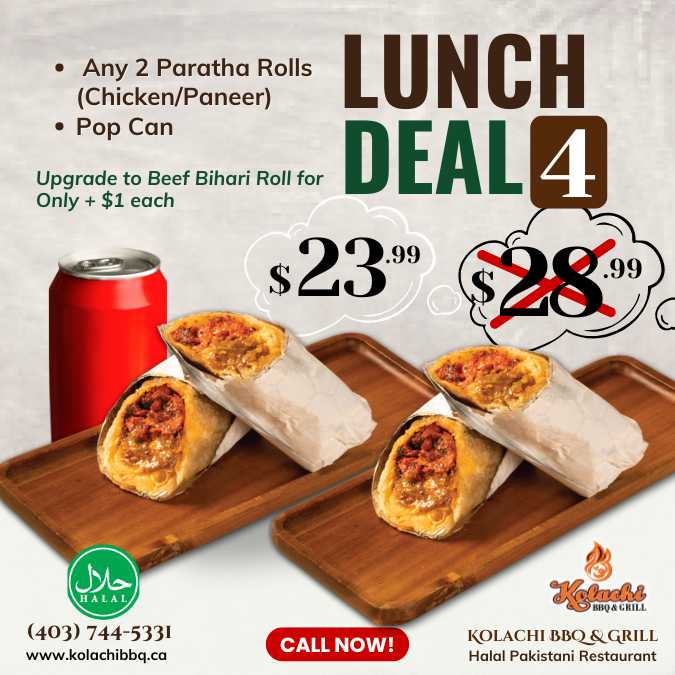 (Monday to Thursday | 1:00pm to 5:00pm) - Any 2 Paratha Rolls (Chicken/Paneer), & Pop Can (Upgrade to Beef Bihari Roll for Only + $1 each)