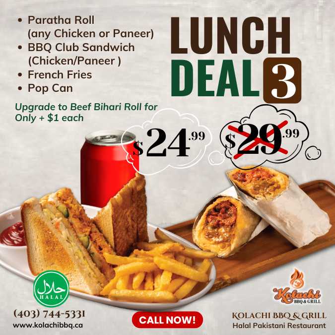 (Monday to Thursday | 1:00pm to 5:00pm) - Paratha Roll (any Chicken or Paneer), BBQ Club Sandwich (Chicken/Paneer), French Fries, & Pop Can