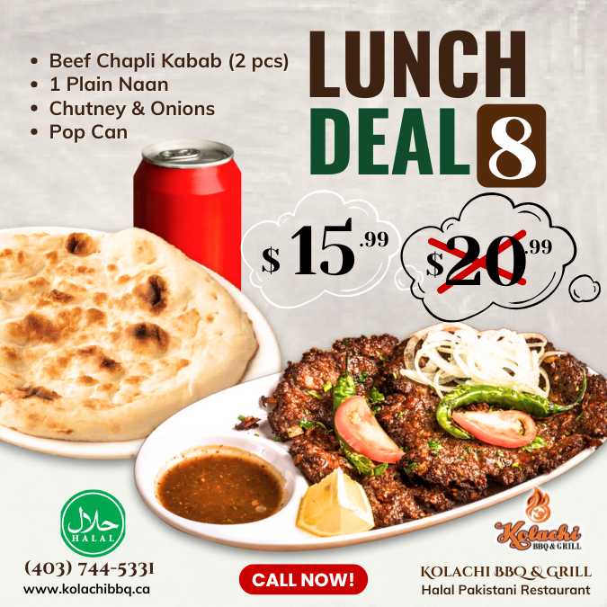 (Monday to Thursday | 1:00pm to 5:00pm) - Beef Chapli Kabab (2 pcs), 1 Plain Naan, Chutney & Onions, &Pop Can