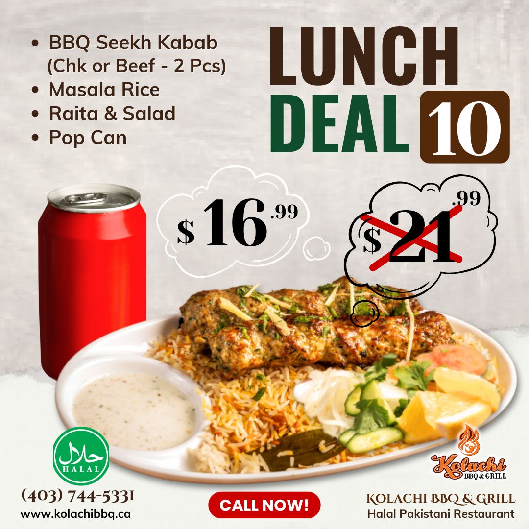 (Monday to Thursday | 1:00pm to 5:00pm) - BBQ Seekh Kabab (Chk or Beef - 2 Pcs), Masala Rice, Raita & Salad, &Pop Can