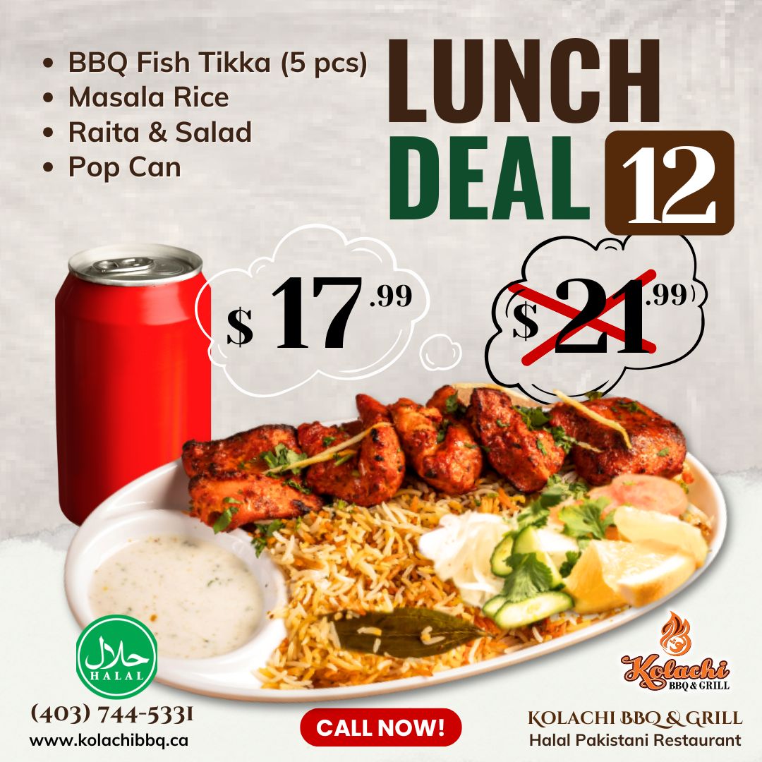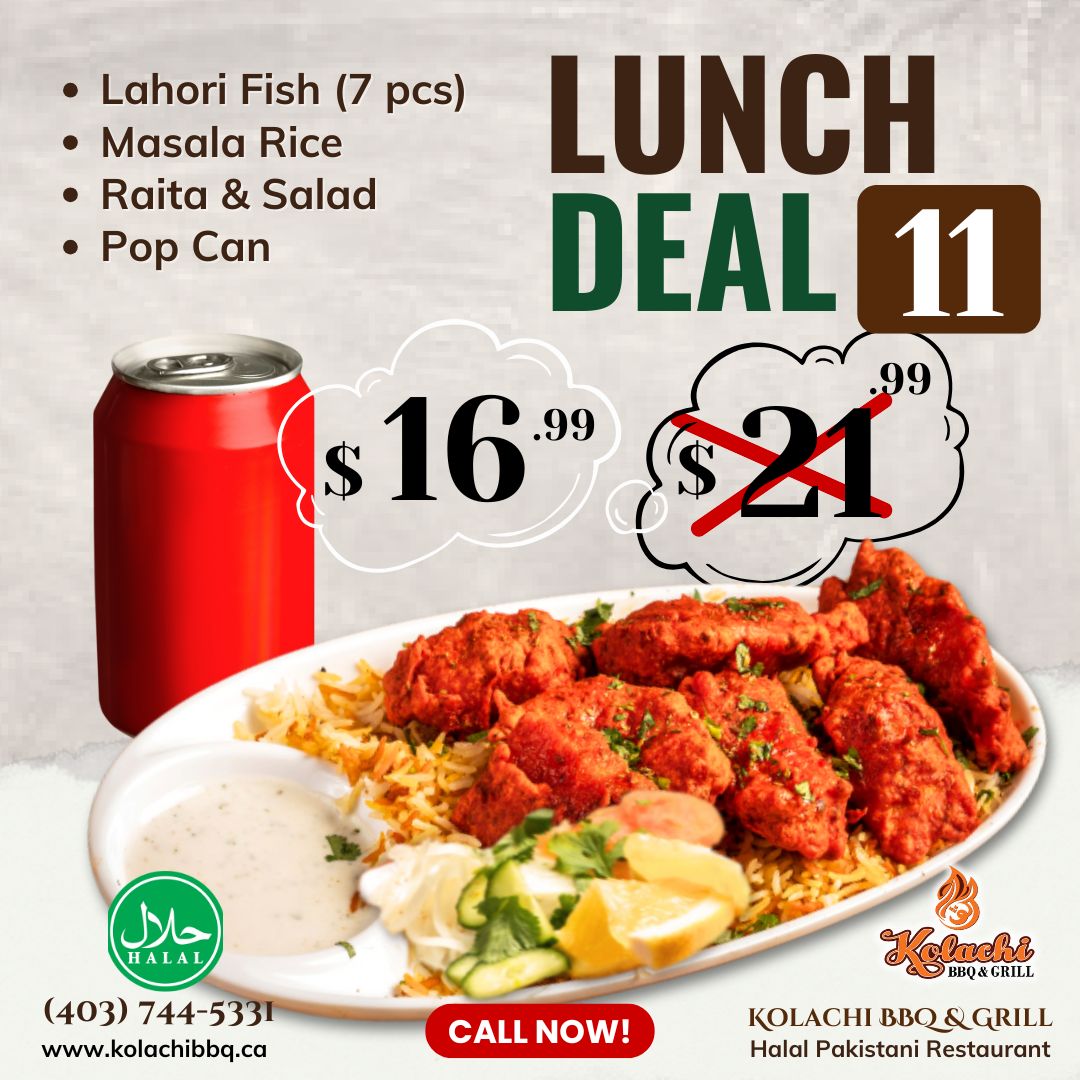 (Monday to Thursday | 1:00pm to 5:00pm) - Lahori Fish (7 pcs), Masala Rice, Raita & Salad, & Pop Can