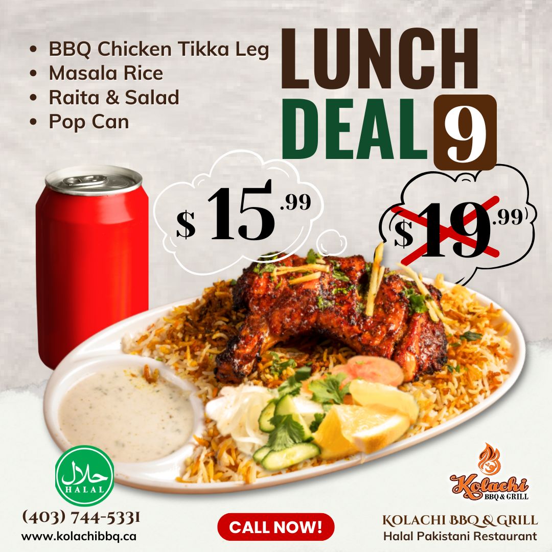 Karachi-style chicken tikka ience (leg back attached), marinated in a vibrant blend of spices and grilled to perfection. Served with Biryani Rice, Salad and Raita. Authentic taste of Karachi